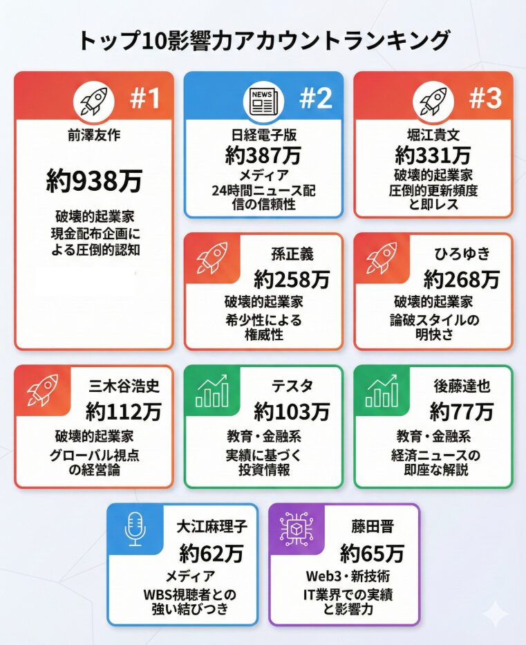今回は、2025年12月時点で影響力のある日本のビジネス系Xアカウントトップ20を、フォロワー数とエンゲージメントの両面から徹底分析しました。「この人をフォローしておけば、ビジネストレンドを見逃さない」という視点で厳選しています。