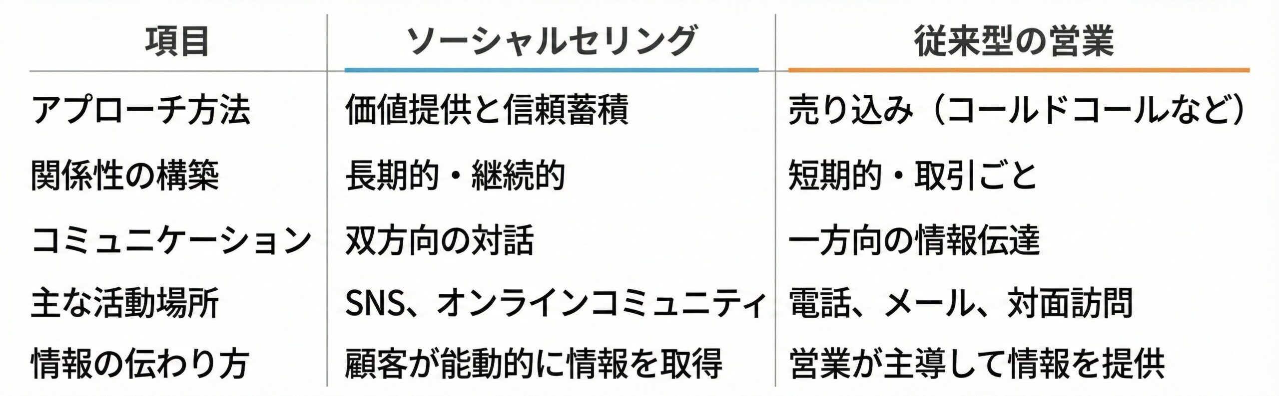 従来の営業手法とソーシャルセリングには、大きな違いがあります。以下の表で比較してみましょう。