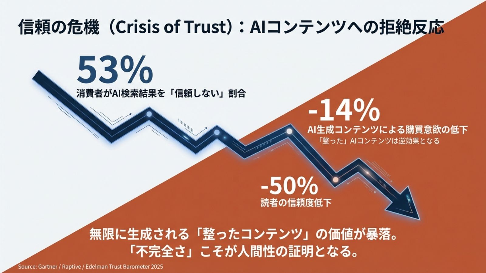 さらに深刻なのは、Edelman Trust Barometerの調査が示す「信頼の危機」です。現代は企業からの公式情報を人々が簡単には信じなくなった時代です。一方的な広告よりも、SNSを通じた専門家個人の発信や、本物の人間関係から生まれる信頼が購買の決め手となっています。
