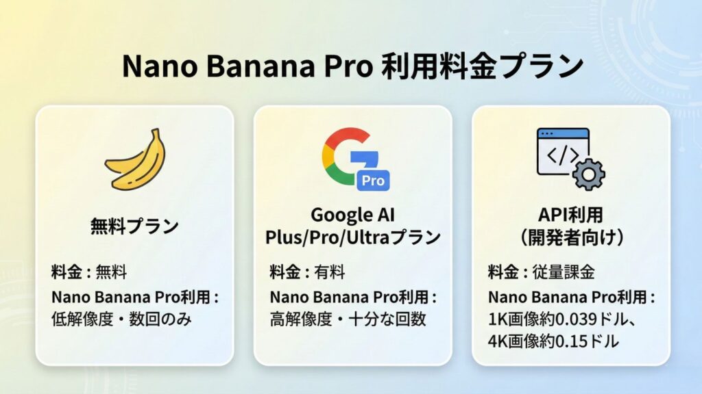 無料ユーザーはクレジット消費後、自動的に通常のNano Bananaモデルに切り替わります。継続的に高品質な出力を得たい場合は、有料プランへの加入が必要です。