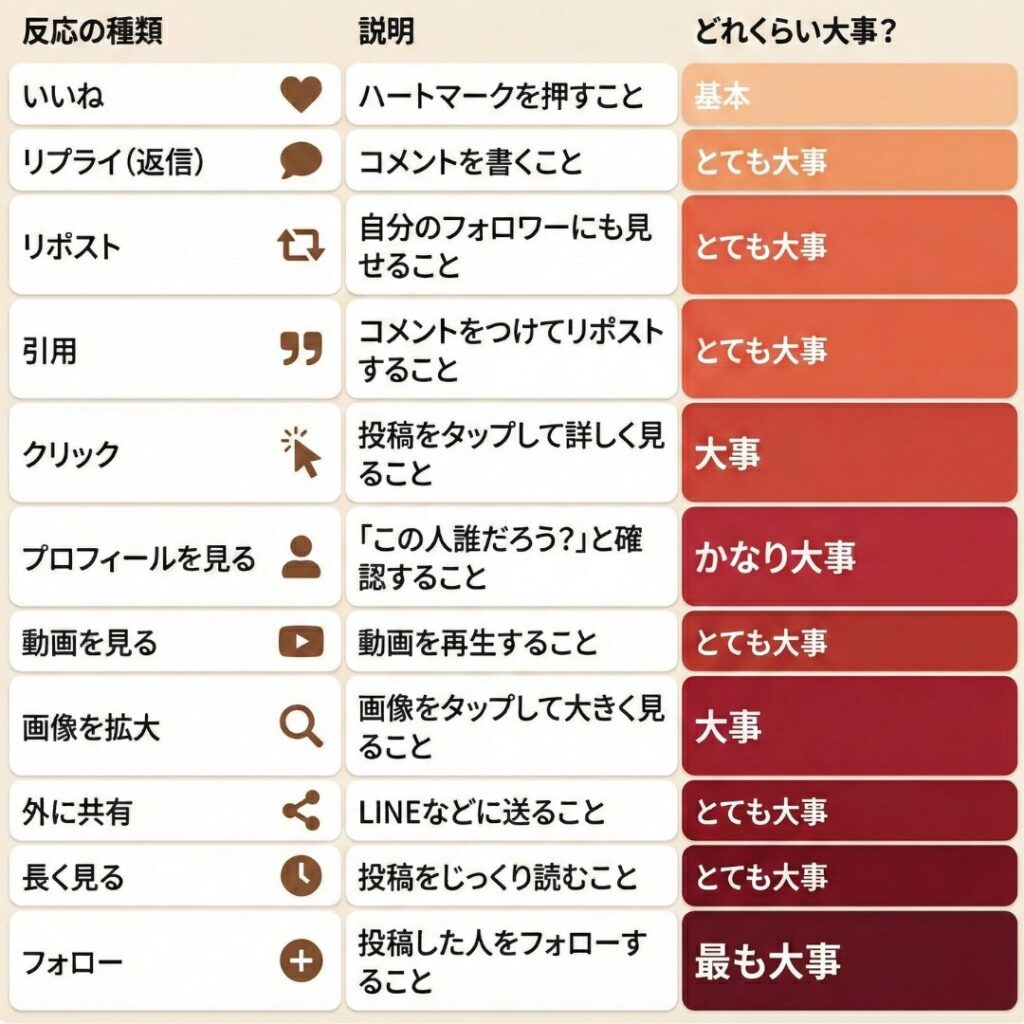 AIは「この投稿を見た人が、どんな反応をしそうか」を予測します。良い反応がたくさんありそうな投稿ほど、点数が高くなります。良い反応には、こんなものがあります。